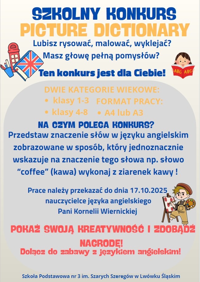 08.10.2025 / Z wielką przyjemnością ogłaszamy wyniki Jesiennego Konkursu Plastycznego „Martwa natura” dla uczniów klas I-III. 🎨🍁 Laureatami zostali: KLASA I – 🥇Kaja Dereń, 🥈Natalia Filipowicz, 🥉Kinga Naryniecka. KLASA II – 🥇Antonina Śliwińska, 🥈Antonina Leszcz, 🥉Jan Czerepak. KLASA III – 🥇Aleksandra Czapla, 🥈Dawid Szewczuk, 🥉Liliana Słodzińska. Przyznano również 10 wyróżnień. Wszystkim laureatom i wyróżnionym serdecznie gratulujemy. Dziękujemy Radzie Rodziców za ufundowanie nagród. Co jest dla nas szczególnie cenne? Wszystkie konkursowe dzieła powstały w szkole, a dzieci pracowały nad nimi całkowicie samodzielnie. Brawo, młodzi artyści! 👏 Dziękujemy wszystkim uczestnikom za udział w konkursie.